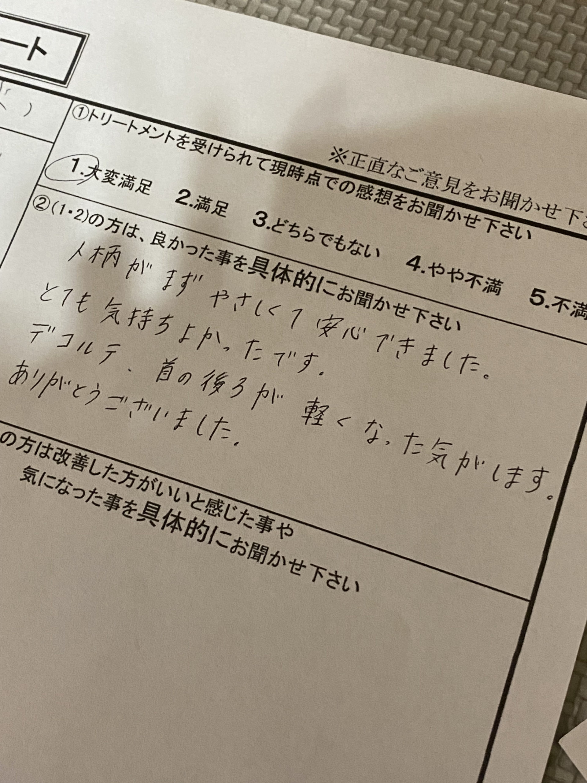 人柄がまず優しくて安心できました。とても気持ちよかったです。デコルテ・首の後ろが軽くなった気がします。ありがとうございました。
