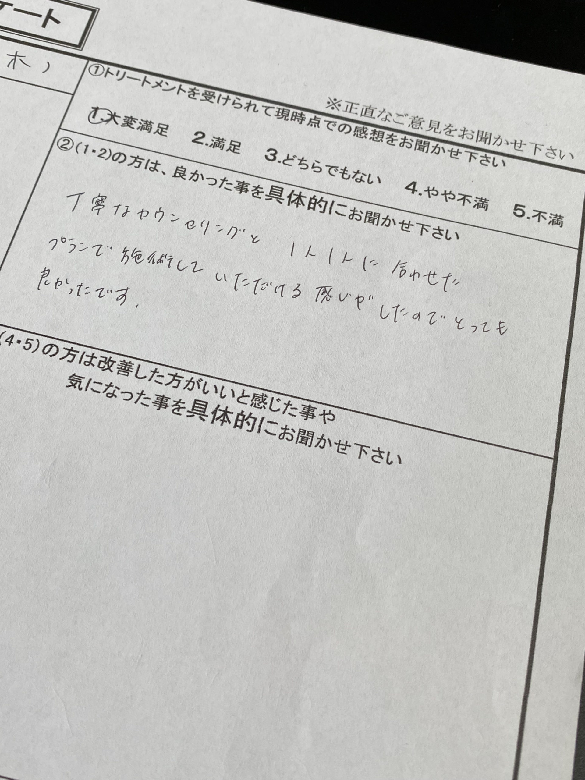 丁寧なカウンセリングと一人一人に合わせたプランで施術して頂ける感じがしたのでとってもよかったです。