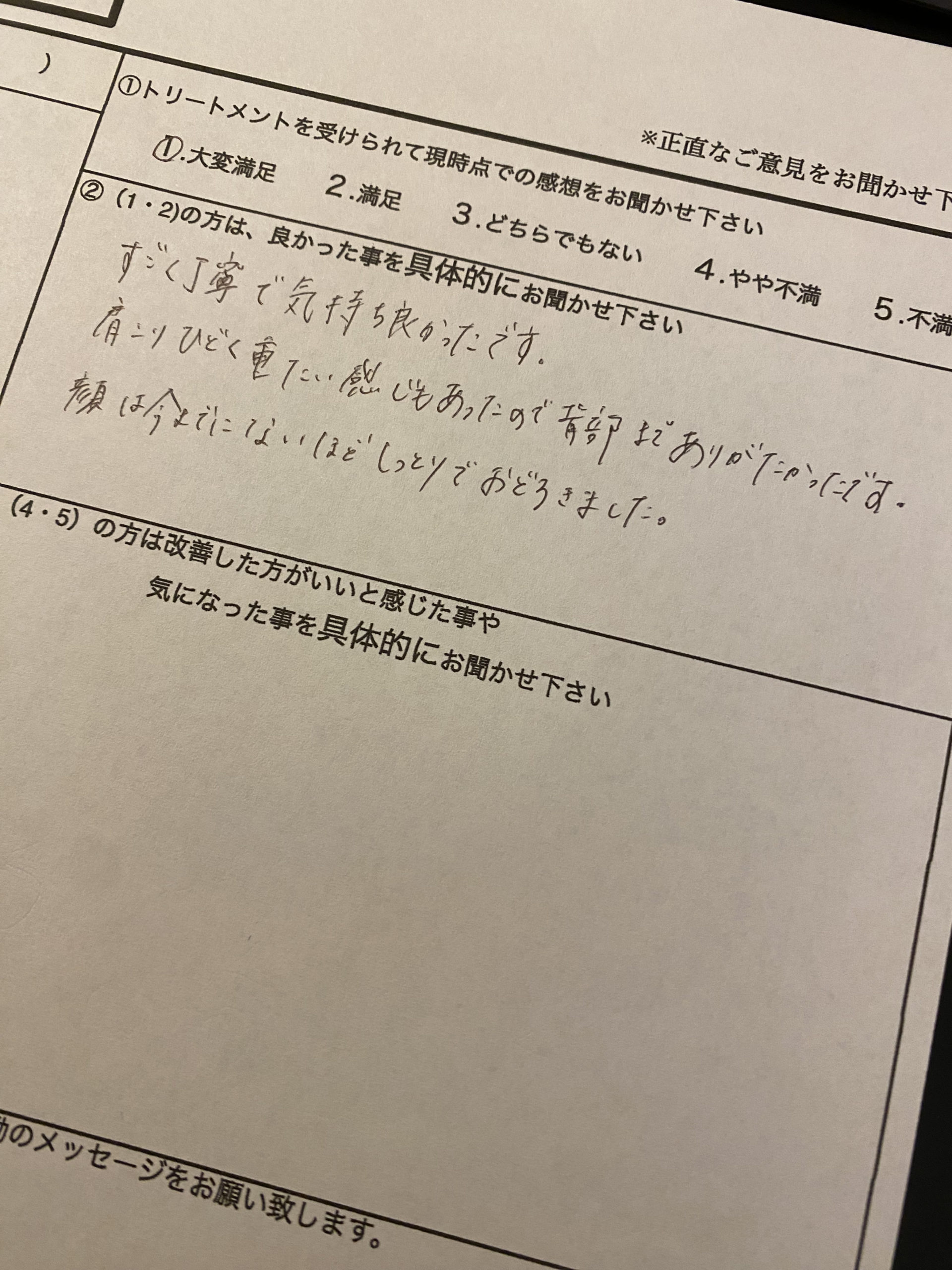 すごく丁寧で気持ちよかったです。肩こりひどく重たい感じもあったので背部までありがたかったです。顔は今までにないほどしっとりで驚きました。
