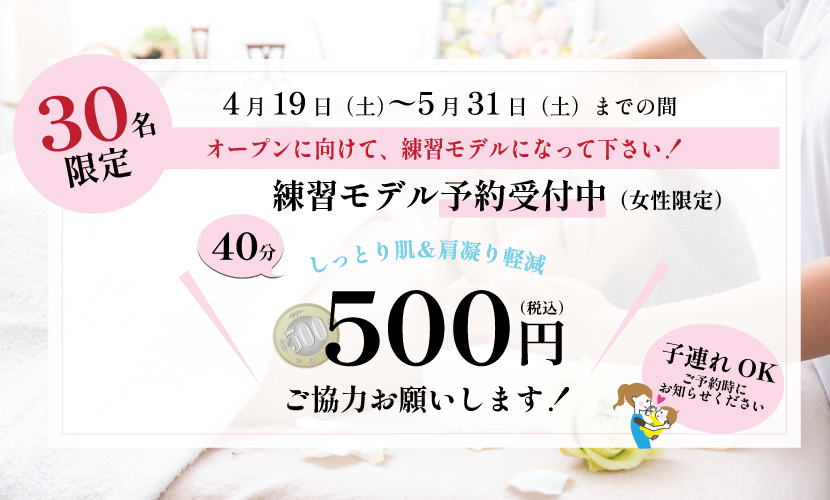 4月から始めておりました、練習モデルさんの募集を終了とさせて頂きます。ご協力ありがとうございました!お客様からのご紹介もあり、おかげさまで40名を越える方からのご協力を頂いております。まだ数名施術がまだの方がいらっしゃいますので50名近くになりそうです・・・!おかげさまで自信を持ってオープンすることができました。これからも日々技術力アップのために精進して参りますので、肌質改善エステRISIMIN(リスミン)をよろしくお願い致します。