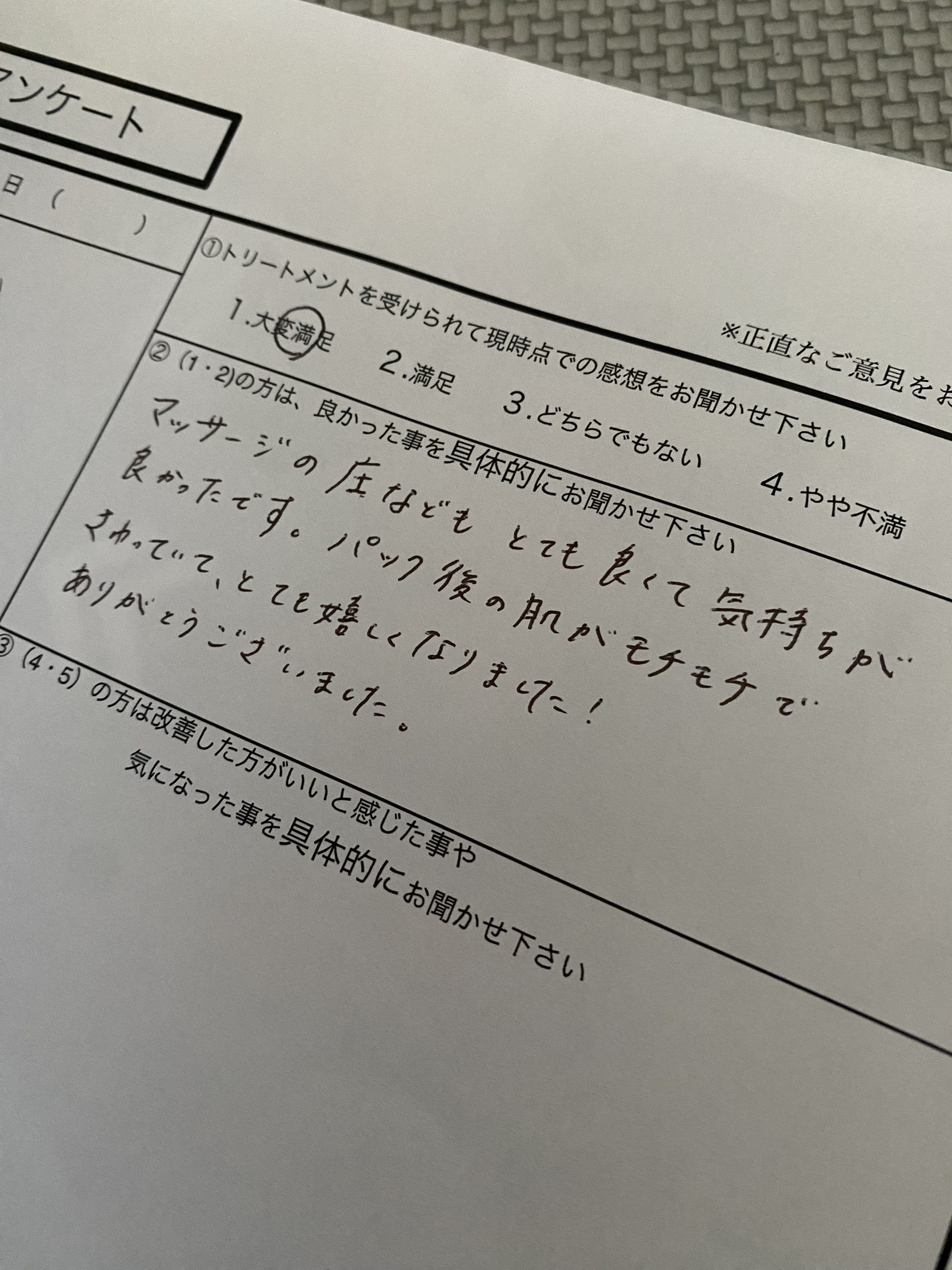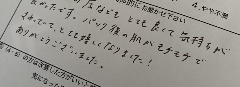 マッサージの圧などもとても良くて気持ちがよかったです。パック後の肌がモチモチでさわっていて、とても嬉しくなりました!ありがとうございました。
