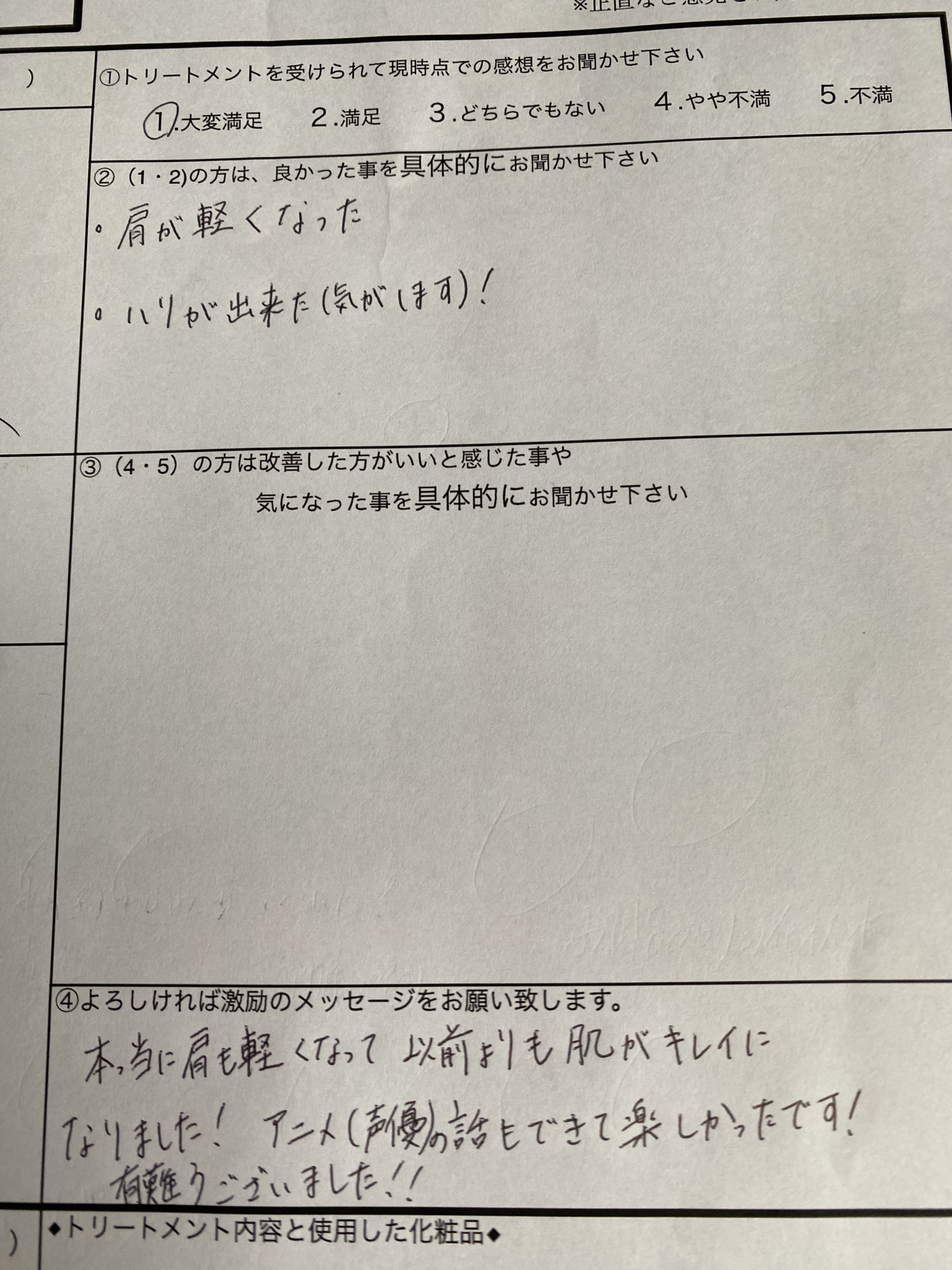 肩が軽くなった、ハリが出来た気がします!本っ当に肩も軽くなって以前よりも肌がキレイになりました!アニメ(声優)の話もできて楽しかったです!有難うございました!!